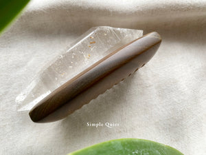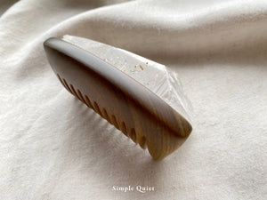 手工木梳難能可貴的是它一體成形,每個轉折處的溫潤如玉,讓手掌與握柄每一次的接觸都像是一種溫柔安撫。而木材特有的靈氣,以及師傅取材的好眼光,讓每一柄梳子的風味/香氣也各異。余光中先生曾有詩云:「且留清香在絕頂」,便是在稱讚這手工木梳。