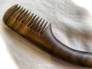 手工木梳難能可貴的是它一體成形,每個轉折處的溫潤如玉,讓手掌與握柄每一次的接觸都像是一種溫柔安撫。而木材特有的靈氣,以及師傅取材的好眼光,讓每一柄梳子的風味/香氣也各異。余光中先生曾有詩云:「且留清香在絕頂」,便是在稱讚這手工木梳。