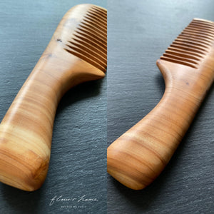 手工木梳難能可貴的是它一體成形,每個轉折處的溫潤如玉,讓手掌與握柄每一次的接觸都像是一種溫柔安撫。而木材特有的靈氣,以及師傅取材的好眼光,讓每一柄梳子的風味/香氣也各異。余光中先生曾有詩云:「且留清香在絕頂」,便是在稱讚這手工木梳。