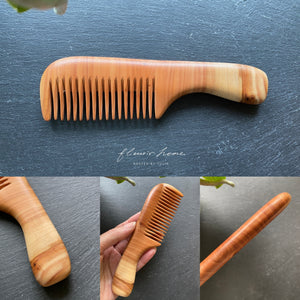 以梳型可以分為有柄梳和無柄梳兩大類。有柄梳的握柄最為合手,可以輕鬆掌握,也很適合以「梳齒」的部分敲打身體以緩解酸痛。但切記不可以用拍打的方式,因為木梳皆以樹木的橫切面去製作,梳齒方向與木頭的肌理平行,較為堅固耐用,但用力拍打有可能使木梳斷裂。