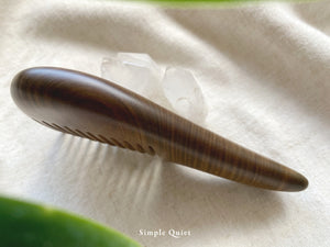 梳頭能使「頭不白」、「髮不落而生」。沒有另外上保護漆的木梳,保留了樹木靈動的氣蘊,溫和而自然的質地最能和身體髮膚互相共鳴。