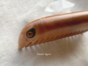 手工木梳難能可貴的是它一體成形,每個轉折處的溫潤如玉,讓手掌與握柄每一次的接觸都像是一種溫柔安撫。而木材特有的靈氣,以及師傅取材的好眼光,讓每一柄梳子的風味/香氣也各異。余光中先生曾有詩云:「且留清香在絕頂」,便是在稱讚這手工木梳。
