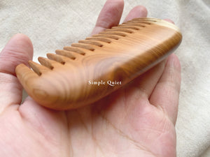手工木梳難能可貴的是它一體成形,每個轉折處的溫潤如玉,讓手掌與握柄每一次的接觸都像是一種溫柔安撫。而木材特有的靈氣,以及師傅取材的好眼光,讓每一柄梳子的風味/香氣也各異。余光中先生曾有詩云:「且留清香在絕頂」,便是在稱讚這手工木梳。