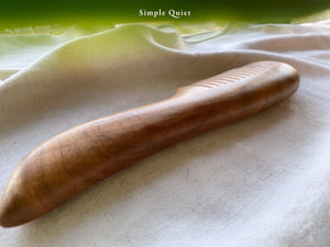 燕尾梳的特色在於翹起的尾端極適合穴道按摩,微微尖起卻又圓潤,適合按摩周身穴道也不會太過刺激。燕尾的弧度也使整體的握持感更有張力,在梳理身體時更能感受到木梳的柔軟與強韌。