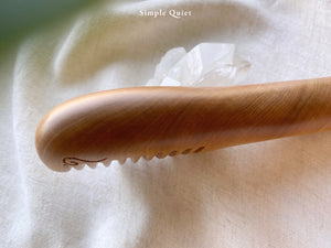 燕尾梳的特色在於翹起的尾端極適合穴道按摩,微微尖起卻又圓潤,適合按摩周身穴道也不會太過刺激。燕尾的弧度也使整體的握持感更有張力,在梳理身體時更能感受到木梳的柔軟與強韌。