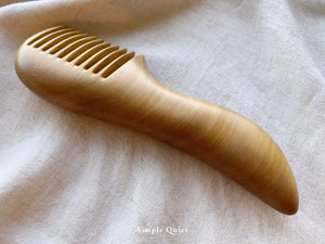 手工木梳難能可貴的是它一體成形,每個轉折處的溫潤如玉,讓手掌與握柄每一次的接觸都像是一種溫柔安撫。而木材特有的靈氣,以及師傅取材的好眼光,讓每一柄梳子的風味/香氣也各異。余光中先生曾有詩云:「且留清香在絕頂」,便是在稱讚這手工木梳。