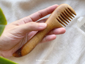 以梳型可以分為有柄梳和無柄梳兩大類。有柄梳的握柄最為合手,可以輕鬆掌握,也很適合以「梳齒」的部分敲打身體以緩解酸痛。但切記不可以用拍打的方式,因為木梳皆以樹木的橫切面去製作,梳齒方向與木頭的肌理平行,較為堅固耐用,但用力拍打有可能使木梳斷裂。