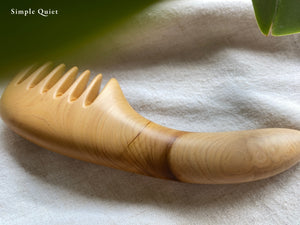 木梳溫和而自然的質地最能和身體髮膚互相共鳴,不同木種鍛造出不同質地的梳背手感,或圓潤輕盈,或硬挺厚實,每柄木梳都蘊含了樹木歷經百年的生命力,不僅梳理頭髮、按摩頭皮,也能夠梳理身體、按摩肌肉和穴道,把周身的氣結梳理開,提醒我們身體存在的意義。